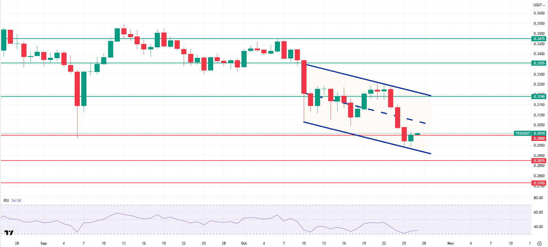 Technically speaking, TRX started the week at 0.3205 and closed the week at 0.3002, falling approximately 6.5% over the course of the week. Thus, TRON, which has completed its third consecutive week of decline, has a market value of $28.4 billion. Currently trading at 0.3010, TRX is just above the lower band of the bearish channel on the daily chart and is hovering close to the 0.3000 support level. The Relative Strength Index (RSI) value is observed to be very close to the oversold zone at 34. Considering its position within the bearish channel and the RSI indicator, the TRX price may be expected to rise. This indicates that it may want to move towards the upper band of the channel. In such a case, it may test the 0.3190 resistance. If it closes above the 0.3190 resistance on a daily basis, it may want to test the 0.3355 resistance. If it fails to close above the 0.3190 resistance level and selling pressure increases in the market, it may decline due to potential selling from this area. In such a case, it may test the 0.3000 and 0.2875 support levels in sequence. The 0.2765 level is being monitored as a critical support point on the daily chart. Sustaining above this level could maintain the upward trend, while closes below it could lead to increased selling pressure and deeper downward price movements.