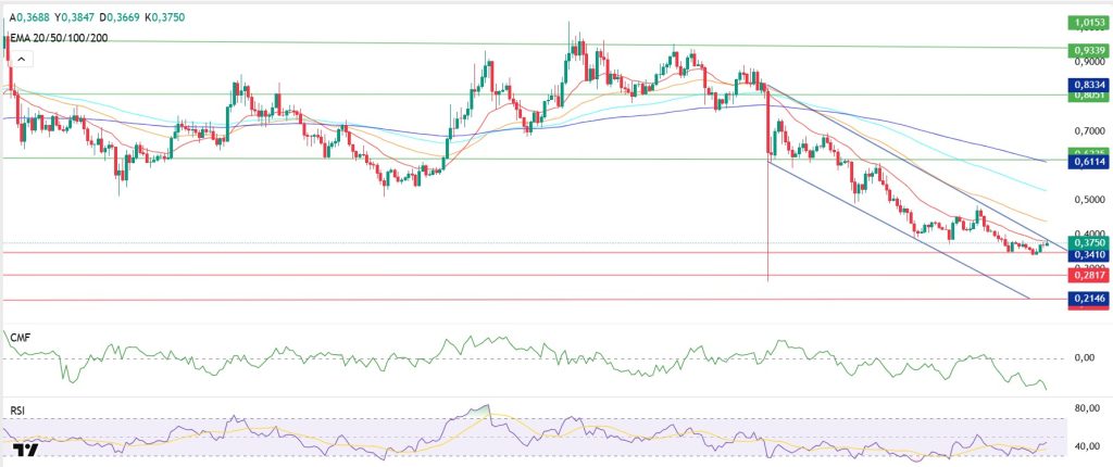 Although it continues to trade below the 50-day and 200-day Exponential Moving Average (EMA 50 – Orange Line) (EMA 200 – Blue Line), it intersects with the 20-day EMA (Red Line). If the price remains above the 20-day moving average, the $0.4270 level can be monitored as the first resistance level. With the reaction it receives from here, the continuation of the upward movement to the $0.6203 level, which is the peak of the downtrend, can be expected. These levels appear as an area indicating that ADA buyers are willing to buy at higher prices and that buyer pressure is increasing over time. The retest of this area may play a critical role in completing the downtrend channel. If the price breaks above the 20-day Exponential Moving Average ) level, it is expected to close above the 50-day Exponential Moving Average (EMA 50 – Blue Line). The Relative Strength Index (RSI) continues to hover near neutral territory at 44 levels, while the Chaikin Money Flow (CMF-20) remains at -0.25 levels, indicating that the price is operating in the sell zone. If the price falls as a result of the macroeconomic data expected to be announced this week and the statements to be made by US President Trump, the important levels we will follow are the bottom of the downtrend at $0.3732. In the event of closes below this level, the support level can be followed at the $0.2817 to $0.2146 band.
