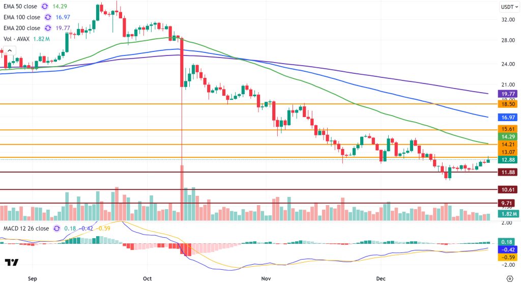 Starting last week at $12.14, AVAX tested the $11.88 support level following a decline at the beginning of the week. Buying activity at this level pushed AVAX higher, resulting in a weekly close of $12.64. The AVAX price increased by approximately 4.1% on a weekly basis. AVAX started the new week with an upward trend, testing the $13.07 resistance level, but experienced a decline due to selling pressure in this region. Despite the upward momentum, a strong momentum has not yet formed. On December 26, 2025, the Avalanche Network surpassed a total of 10 billion transactions across all Layer-1 networks, once again demonstrating the ecosystem’s usage and scaling power. Despite this strong growth in on-chain activity, the ongoing low volume in the cryptocurrency market meant that this positive development did not have a significant short-term impact on the AVAX price.
