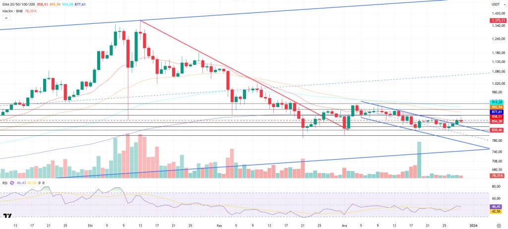 From a technical perspective, the correction that began after the all-time high (ATH) retreated to the $790 support zone identified in previous analyses. After seeking support at these levels for a while, BNB ended its downward momentum with the candlestick formations that formed and turned its direction upward again. With this recovery, the price gained positive momentum towards the descending trend line; with the support of new candles, it broke the descending trend upwards and rose to the $930 level. However, increased selling pressure was observed in this region, depending on market conditions. With the effect of increased selling pressure, the asset appears to have continued its movement within a descending channel for some time.