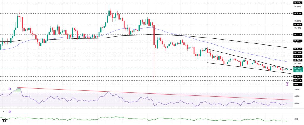 The asset continued to trade below the 50 EMA (Blue Line) and 200 EMA (Exponential Moving Average – Black Line) moving averages. This indicates that the asset is in a downward trend. On the other hand, the 50 EMA moving average being below the 200 EMA moving average shows us that the “dead cross” formation is continuing. This also indicates that the asset has the potential to lose value at this moment. The Chaikin Money Flow (CMF–20) indicator remained in negative territory. Money inflows continue to decline. This could push the CMF-20 deeper into negative territory. Looking at the Relative Strength Index (RSI-14) indicator, it rose from the oversold zone to the middle of the negative zone. At the same time, it remained below the downward trend line that has been in place since September 13. This indicates that selling pressure may continue. In the event of macroeconomic risks or negative news from the ecosystem, the $0.10495 level can be monitored as a strong support. On the other hand, if the upward movement gains momentum , the $0.17085 level comes to the fore as the first strong resistance level.