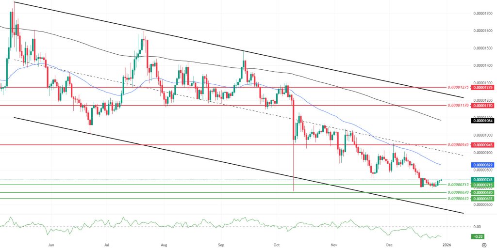 This week’s technical chart reveals a structure where the downward trend’s pressure has not entirely subsided, but the ability to recover in the near term has clearly strengthened. As both volume and momentum rise, the decline in volatility indicates that the upward initiative is supported by more controlled buying rather than panic-driven congestion. However, the Chaikin Money Flow (CMF) indicator remaining negative suggests that net buyer liquidity entering the market is still weak and that capital inflows need to strengthen for the upward movement to continue. The price being below the 50-period Exponential Moving Average (EMA) and the 200-period Exponential Moving Average (EMA) also indicates that the main trend is still downward and that the recent movement is more of a reaction wave within the downtrend than a reversal of the trend. The fact that the $0.00000715 support zone has not been broken and that the price has reacted from this level and moved rapidly towards $0.00000740 indicates that sellers’ energy is waning and that the market is seeking equilibrium in the bottom zone. However, even if the market is not very volatile, it is important to remember that this reaction could lead to a rapid price change after the squeeze ends. If the price closes below $0.00000715 for several days in a row, the support levels of $0.00000670 and $0.00000635 will regain importance. (EMA200: Black line, EMA50: Blue line)