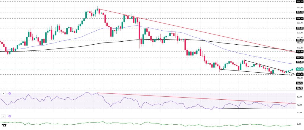 The SOL price experienced a slight increase on the daily chart this week. The asset remained in the lower region of the downtrend that began on September 18. Testing the strong support level of $116.81 and the base level of the descending wedge formation as support, the price accelerated from there and broke above the descending wedge formation. Currently trading in the upper region of the descending wedge formation, the price may test the 50 EMA (Blue Line) moving average as resistance if the uptrend continues. In the event of a pullback, it may test the ceiling level of the descending wedge formation as support.