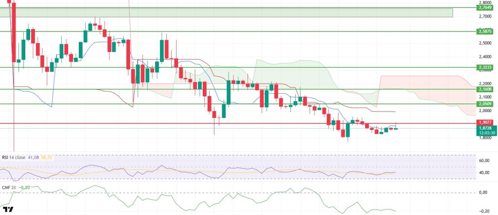 Sales accelerated with the loss of the main support level at $1.90 at the beginning of last week, and the price retreated to the $1.82 level. After a rebound from this level, the price tested $1.90 again after the weekly close, but this attempt was not sustained. Selling pressure from this level pushed the price back down to around $1.87. The failure to break above $1.90 again indicates that upward attempts are still meeting resistance and that the market does not view this area as safe.