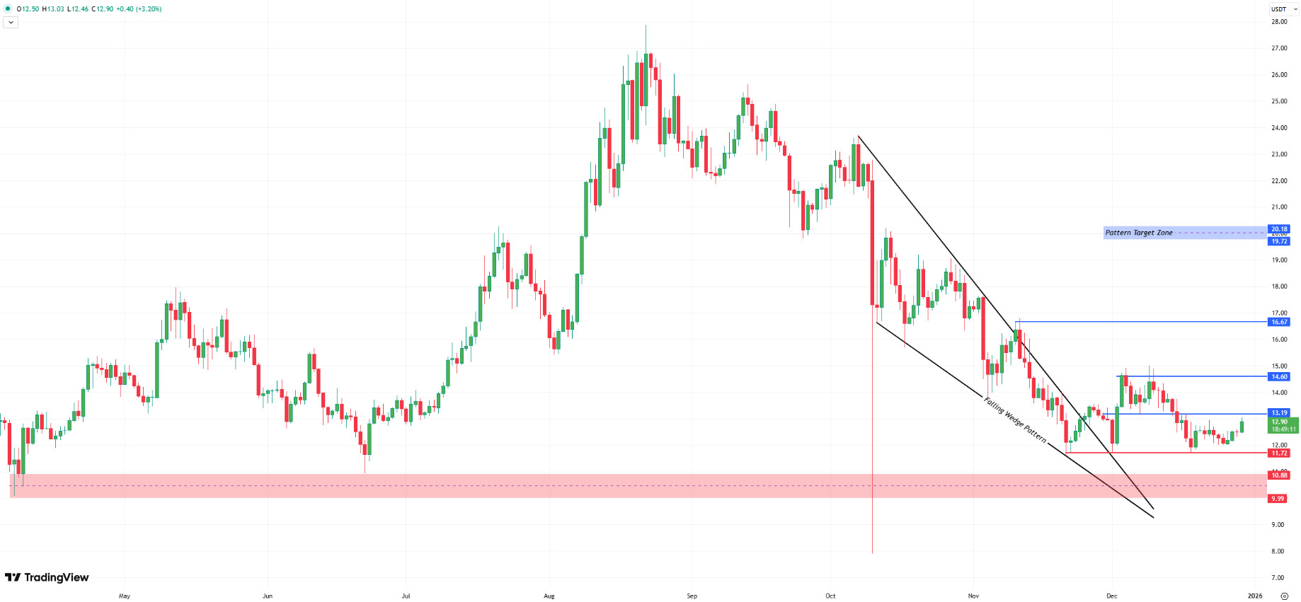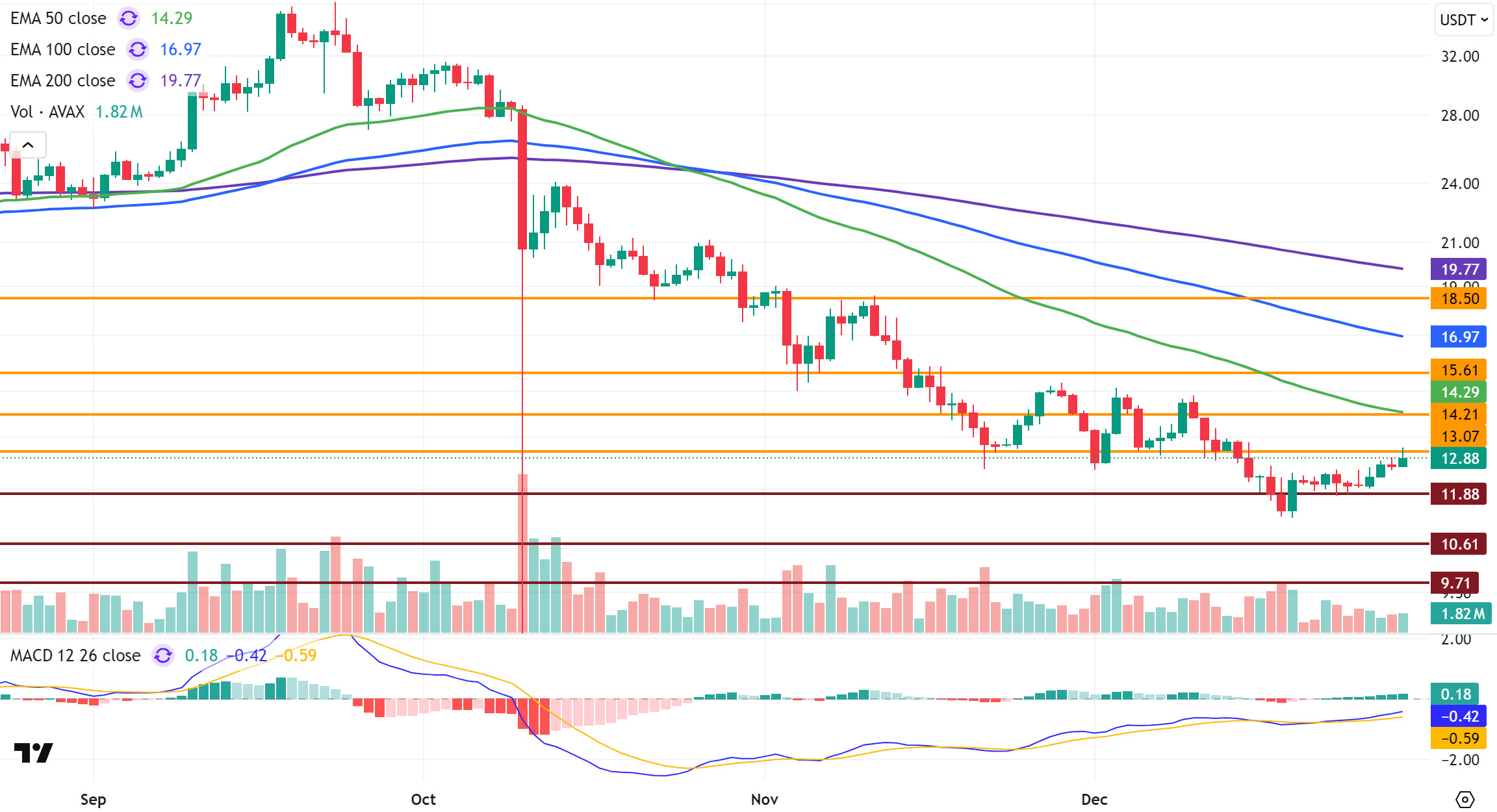 Starting last week at $12.14, AVAX tested the $11.88 support level following a decline at the beginning of the week. Buying activity at this level pushed AVAX higher, resulting in a weekly close of $12.64. The AVAX price increased by approximately 4.1% on a weekly basis. AVAX started the new week with an upward trend, testing the $13.07 resistance level, but experienced a decline due to selling pressure in this region. Despite the upward momentum, a strong momentum has not yet formed. On December 26, 2025, the Avalanche Network surpassed a total of 10 billion transactions across all Layer-1 networks, once again demonstrating the ecosystem’s usage and scaling power. Despite this strong growth in on-chain activity, the ongoing low volume in the cryptocurrency market meant that this positive development did not have a significant short-term impact on the AVAX price.