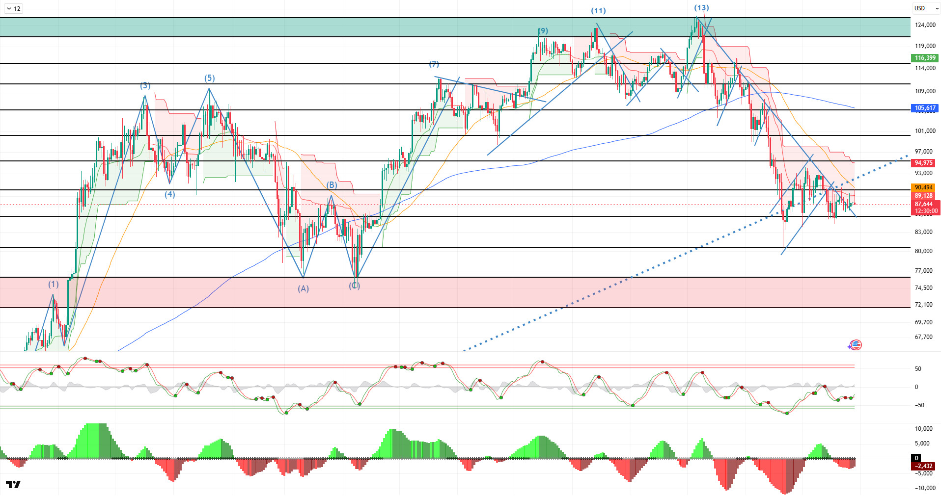 The technical outlook has not changed significantly from the Ichimoku indicator perspective. Although the price is trading close to the Tenkan level, it remains below the Kijun and kumo cloud. This structure indicates that the medium-term trend is still in negative territory and that upward movements remain fragile. It is difficult to talk about a trend reversal without seeing a clear improvement on the Ichimoku side.