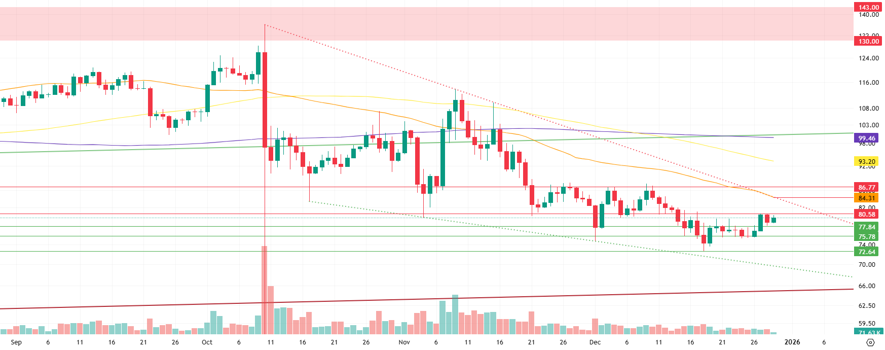 On the other hand, contrary to general expectations, support levels where buying interest could be expected in the event of pullbacks are 77.84, 75.78, and 72.64, respectively. Among these levels, 77.84 is the key threshold of the current balanced price structure and acts as a moderately reliable support. Maintaining this region is critically important for the upward scenario to continue healthily. The 75.78 level, located in a lower zone, offers a technically stronger and more active support area, while the 72.64 level is essentially the “last line of defense” in the technical outlook. A downward breach of this level could drag the price into a new wave of decline towards the descending trend support and fundamentally alter the current technical picture.