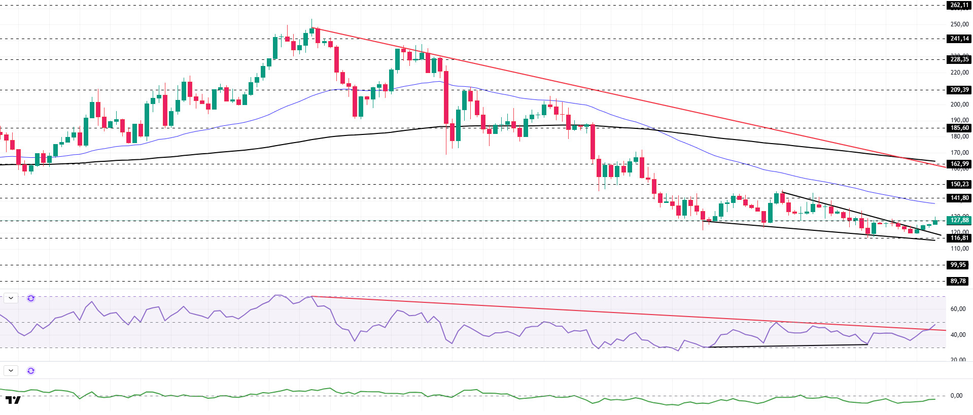 The SOL price experienced a slight increase on the daily chart this week. The asset remained in the lower region of the downtrend that began on September 18. Testing the strong support level of $116.81 and the base level of the descending wedge formation as support, the price accelerated from there and broke above the descending wedge formation. Currently trading in the upper region of the descending wedge formation, the price may test the 50 EMA (Blue Line) moving average as resistance if the uptrend continues. In the event of a pullback, it may test the ceiling level of the descending wedge formation as support.