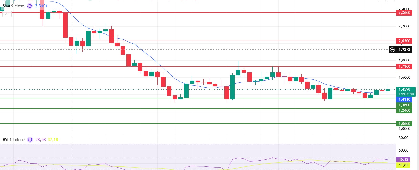 Following recent developments, when we look at Sui’s technical outlook, we see that the price has been moving sideways at around $1.45 on a weekly basis, influenced by fundamental developments. The Relative Strength Index (RSI) is currently in the range of 46.12 – 41.82. This range indicates that the market is trading close to the buy- e zone; the RSI continuing close to the 40.00 – 45.00 range in these areas may signal a potential buying point. If the price moves upward, the resistance levels of $1.73, $2.03, and $2.36 can be monitored. However, if the price falls to new lows, it may indicate that selling pressure could deepen. In this case, the support levels of $1.36, $1.24, and $1.06 come to the fore. Based on the trend line, a pullback to $1.06 appears technically possible. According to Simple Moving Averages (SMA) data, Sui’s average price is currently at $2.34. If the price remains below this level, it signals that the current uptrend will not continue technically.