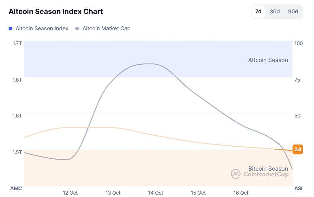 Between October 10 and October 17, 2025, there was an increase in the correlation between altcoin market dominance (Altcoin Market Cap) and the Altcoin Season Index. The chart shows that this week, on September 17 , the index pulled back to 24, with Altcoin Market Cap reaching 1.51T. This indicates an upward trend in the market dominance of altcoins. When the index rose this week, the top 5 coins leading the rise were Myx, Aster, M, Zec, and OKB. On October 13, the index fell from 40 to 24, indicating a potential short-term pullback in the altcoin season.
