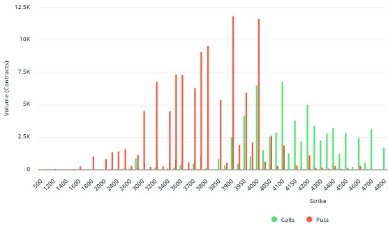 Laevitas Data: Looking at the data in the chart, we see that put options are concentrated particularly at price levels between $3,400 and $3,900. The highest put volume is at the $3,900 level, with approximately 12K contracts, and this level can be considered a potential support zone. On the other hand, call options show a notable concentration between $4,000 and $4,200. The $4,100 level stands out with a high call volume of approximately 7K contracts. This level can be considered an important resistance zone in the market.
