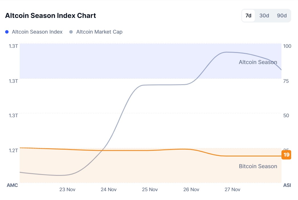 Between November 21 and November 28, 2025, there was a slight decline in the correlation between altcoin market dominance (Altcoin Market Cap) and the Altcoin Season Index. The graph shows that this week, on November 24   , the index fell to 23, indicating that the Altcoin Market Cap reached 1.27T. When the index rose this week, the top 5 coins leading the rise were Aster, Zec, M, Myx, and Dash. On November 27, the index fell from 26 to 21, indicating the potential for a decline in the altcoin season.