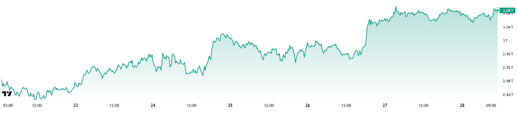 This week, the cryptocurrency market grew by approximately $162 billion, advancing 5.56% and bringing the total market value to $2.91 trillion. The week’s peak was $3.11 trillion, while the lowest level was $2.88 trillion. Thus, the market moved within a band of $228 billion, which translates to a volatility of 7.92%. While this is calmer than last week’s wild 18% range, the crypto market is still moving at its classic “weekly average candle length” level.