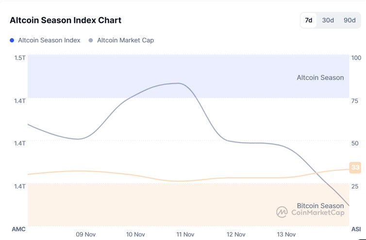 Between November 7 and November 14, 2025, there was a slight increase in the correlation between altcoin market dominance (Altcoin Market Cap) and the Altcoin Season Index. The graph shows that this week, on November 13 , the index rose slightly to 33, with Altcoin Market Cap reaching 1.45T. The top 5 coins leading the rise when the index rose this week were Aster, Zec, Soon, M, and Dash. On November 11, the index rose from 26 to 33, indicating a short-term upside potential for the altcoin season. However, rises below 1.78T indicate that a sustained uptrend has not materialized.
