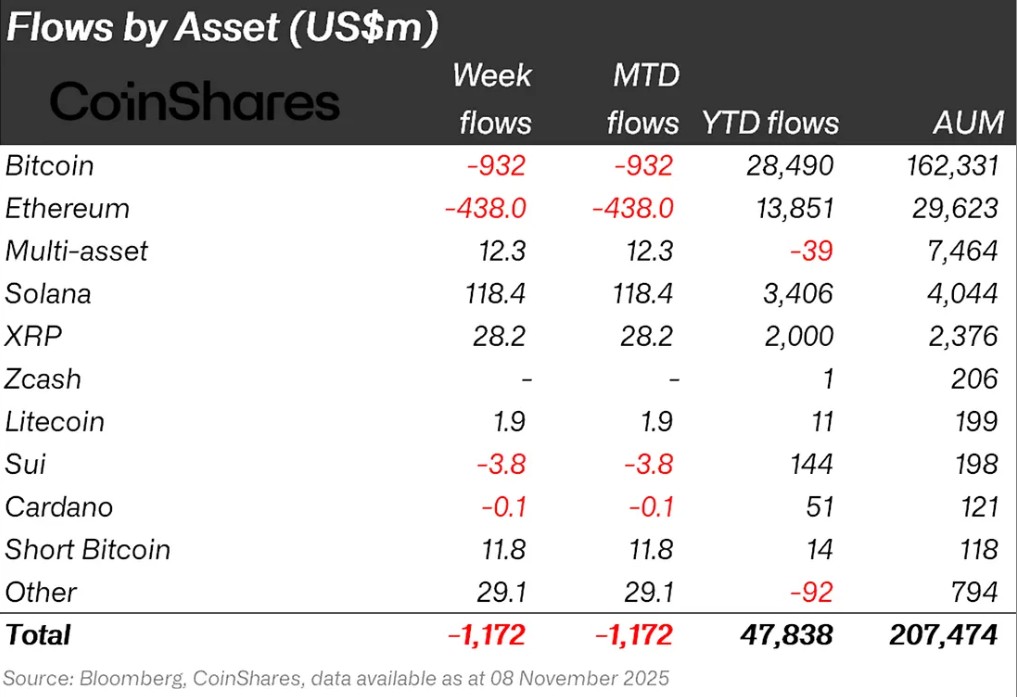 Bitcoin (BTC): Bitcoin continues to see outflows from investors this week. Bitcoin-focused funds experienced $932 million in outflows.