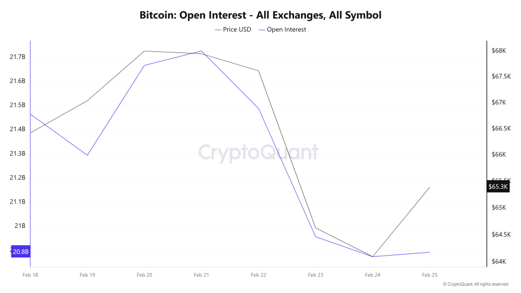 Between February 18 and February 25, recorded 5,598,305 active addresses on the Bitcoin network. During this period, Bitcoin’s price fell from $68,700 at the beginning of the week to $62,471 on February 24. From a technical perspective, the 7-day simple moving average (SMA) is observed to be moving downward.
