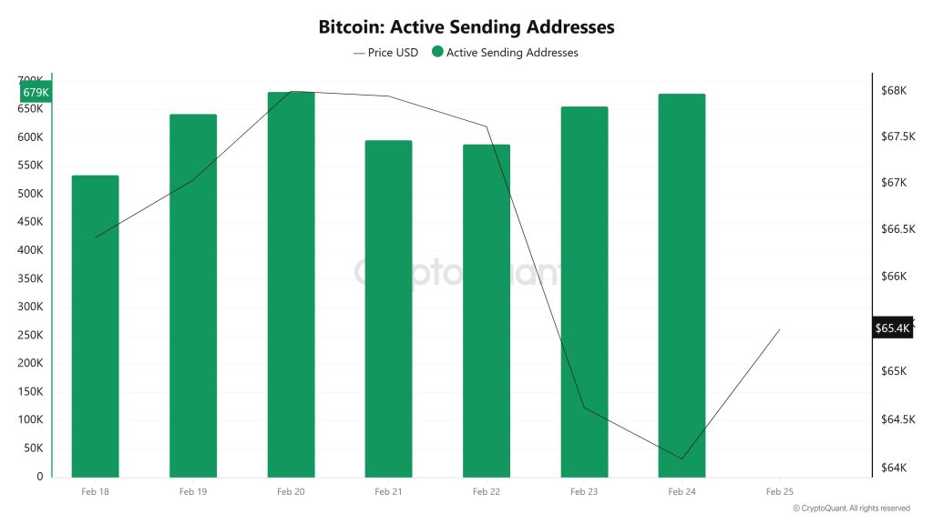 Between February 18 and February 25, an upward trend was observed in the active sending addresses metric. On February 24, when the price reached its highest level, the metric stood at 679,015. This data shows that the $62,500 level was supported not only by price but also by on-chain address activity. Overall, the Active Sending Addresses metric followed a high trajectory during this period.