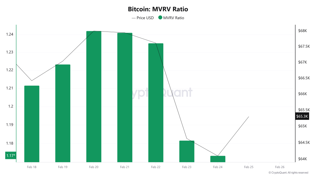 Following the limited recovery seen in Bitcoin’s MVRV last week, this week the indicator is showing renewed weakness. While the price remained relatively flat between February 18 and 22, the MVRV’s downward shift from the 1.24 region indicates that the spot price’s premium relative to its realized cost basis has narrowed. The MVRV’s retreat to around 1.17, particularly during the February 23–24 period, signals that market profit margins are tightening and investors are taking a more cautious stance compared to the previous week. Although there has been a limited recovery in prices, the MVRV’s failure to produce a strong expansion suggests that the uptrend is not yet supported by strong risk appetite. In summary, the downward trend of the MVRV indicates that momentum remains fragile in the short term. For the trend to regain strength, a sustained and significant expansion in the MVRV premium will be critical.