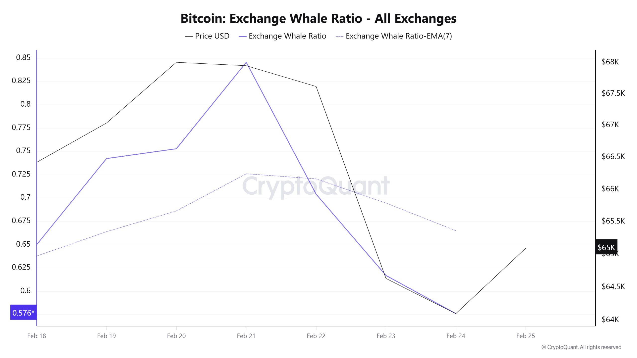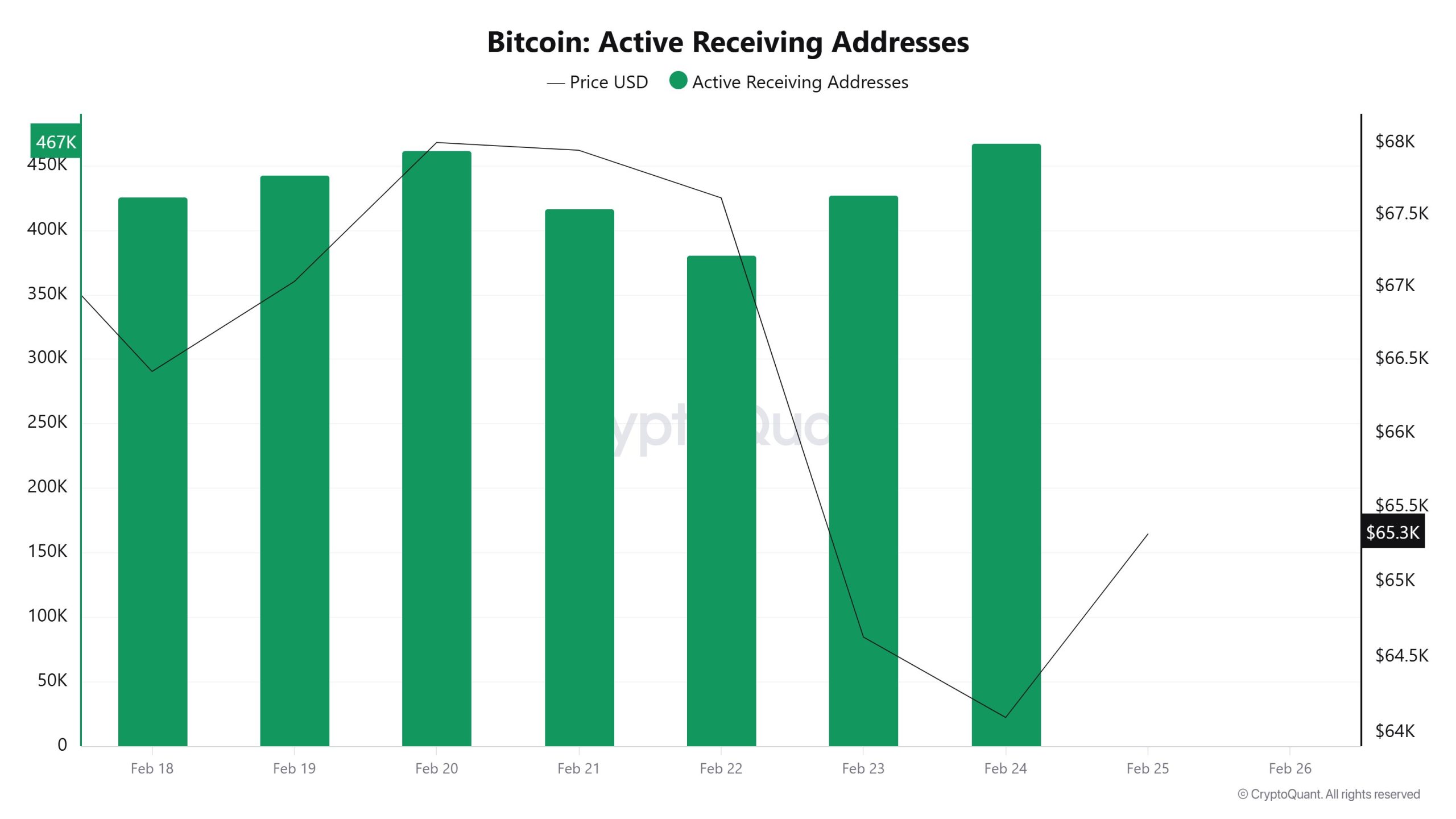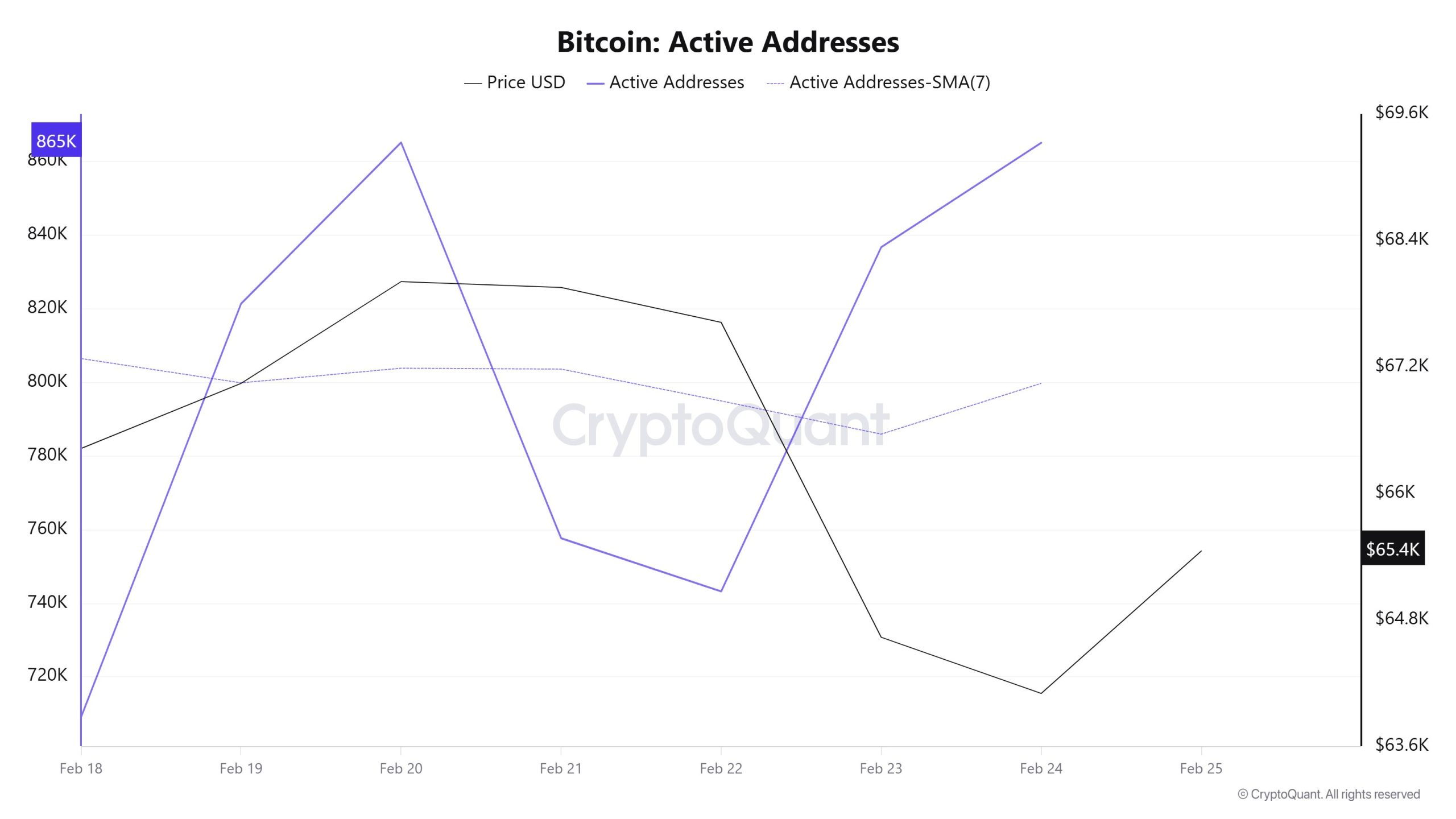 Between February 18 and February 25, recorded 5,598,305 active addresses on the Bitcoin network. During this period, Bitcoin’s price fell from $68,700 at the beginning of the week to $62,471 on February 24. From a technical perspective, the 7-day simple moving average (SMA) is observed to be moving downward.