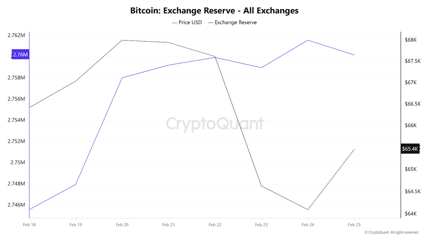 Between February 18 and 24, 2026, Bitcoin reserves on exchanges rose from 2,745,599 BTC to 2,769,188 BTC, resulting in a net inflow of 23,589 BTC. During this period, reserves increased by approximately 0.86%, while the BTC price fell from $66,837.6 to $62,900, losing 5.89% of its value.