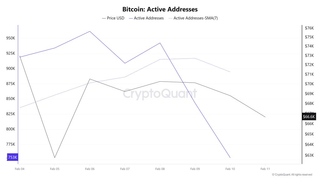 Between February 4 and February 11, recorded 961,697 active addresses on the Bitcoin network. During this period, Bitcoin’s price fell from $73,000 at the beginning of the week to $68,825 on February 4. From a technical perspective, the 7-day simple moving average (SMA) shows a downward trend.