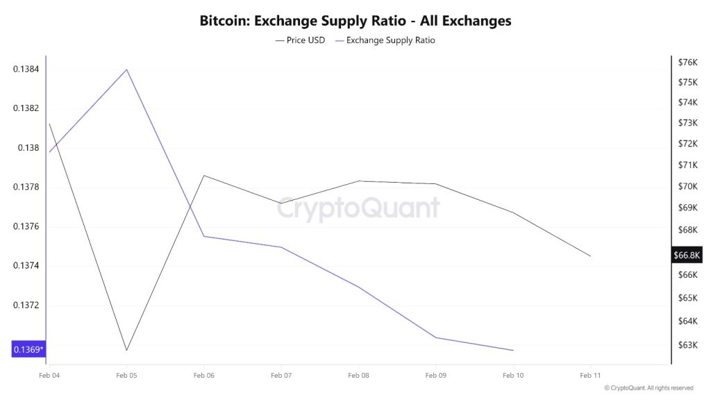 According to Bitcoin Exchange Supply Ratio data, a gradual decline in the Bitcoin supply ratio held on exchanges was observed throughout the week under review. This week, a positive correlation between the Bitcoin price and the supply ratio on exchanges was dominant. The decline in the Exchange Supply Ratio indicates that Bitcoins are being withdrawn from exchanges and held in cold wallets, limiting selling pressure in the short term. Between February 4 and February 11, the Bitcoin Exchange Supply Ratio declined slightly from approximately 0.13798179 to 0.13703817. During the same period, the Bitcoin price retreated from the $73,000 level to the $70,000 range.