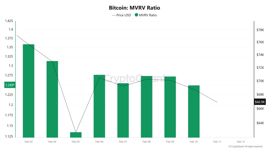 On February 4, while the Bitcoin price was trading at $73,007, the MVRV Ratio was at 1.313. As of February 10, the Bitcoin price fell to $68,825, recording a 5.73% decline, while the MVRV Ratio fell to 1.249, recording a 4.88% decline. The pullback in the MVRV Ratio indicates that the premium relative to the realized cost basis continues to narrow and that unrealized profits maintain their tendency to compress. This outlook suggests that risk appetite remains weak in the short term, and as long as price pressure persists, upward attempts are likely to be met with caution.
