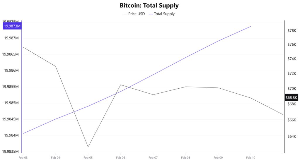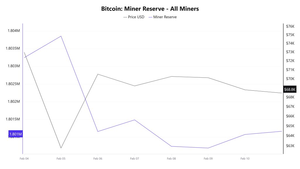 Between February 4 and 10, 89,391 Bitcoin flowed out of miners’ wallets, while 86,419 Bitcoin flowed into miner wallets during the same period. This week’s Miner Netflow was -2,972 Bitcoin. Meanwhile, the Bitcoin price was $73,007 on February 4 and $68,825 on February 10.
