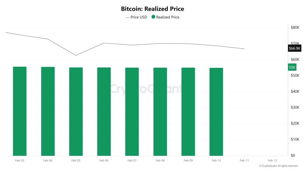 On February 4, while the Bitcoin price traded at $73,007, the Realized Price was at $55,581. As of February 10, the Bitcoin price fell to $68,825, recording a 5.73% decline, while the Realized Price fell to $55,082, recording a limited 0.90% decline. The slight pullback in the Realized Price indicates a limited downward adjustment in the network’s average cost basis, confirming that the spot price’s premium over the cost basis has narrowed again this week. This picture suggests that while spot pricing remains the main driver of selling pressure, the cost basis is also following suit, albeit weakly, on the downside.