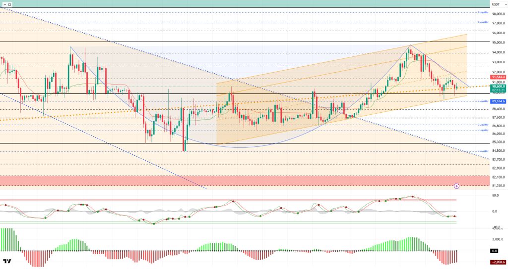 From a technical perspective, BTC spiked below the 90,000 mark once again, which has long served as a reference point for both support and resistance breakouts. Here, the price, which bought liquidity, quickly recovered and first crossed above the major uptrend line. The cup-and-handle and flag continuation patterns it formed became invalid due to the deep correction in price. Accordingly, a minor downtrend channel formed in BTC, and a breakout above the 91,400 resistance level, where the uptrend channel breakout line passes, is possible. Otherwise, selling pressure could cause us to lose the 90,000 level again.