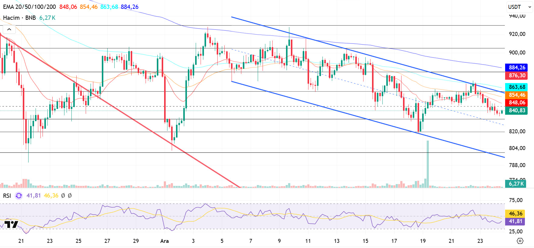 Currently trading in the $830–860 range, technical indicators for BNB reveal that low trading volume is limiting the upward momentum. Additionally, the RSI indicator is seen hovering at relatively low levels due to weak momentum.