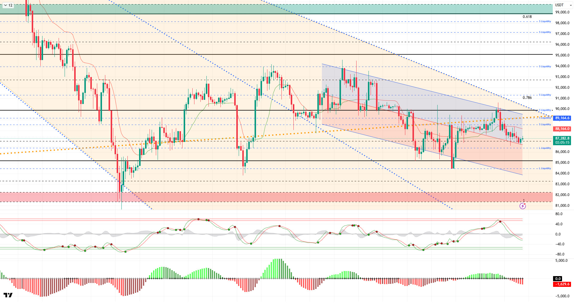In summary, despite falling interest rate cut expectations following US macroeconomic data, President Trump once again emphasized interest rate cuts. On the global geopolitical front, Trump’s Greenland remarks and the Russia-Ukraine conflict are prominent. Meanwhile, as we approach the end of the year, the Christmas lull in the markets is noticeable, while the year-end tax exemption situation may cause shares to change hands. Technically, BTC continues to price with indecisive structures, and a clear upward movement has not yet formed. Looking at liquidity data, it appears that areas with concentrated short-term trading are being targeted, while long-term sell orders have not yet been tested.After this stage, the 89,000 level will be monitored as a critical point where the major upward trend passes through for the price to regain momentum. Closes and price action above this level are important indicators for regaining momentum. If selling pressure deepens, 86,000 emerges as a short-term liquidity area, while the 85,000 level is an important reference point.
