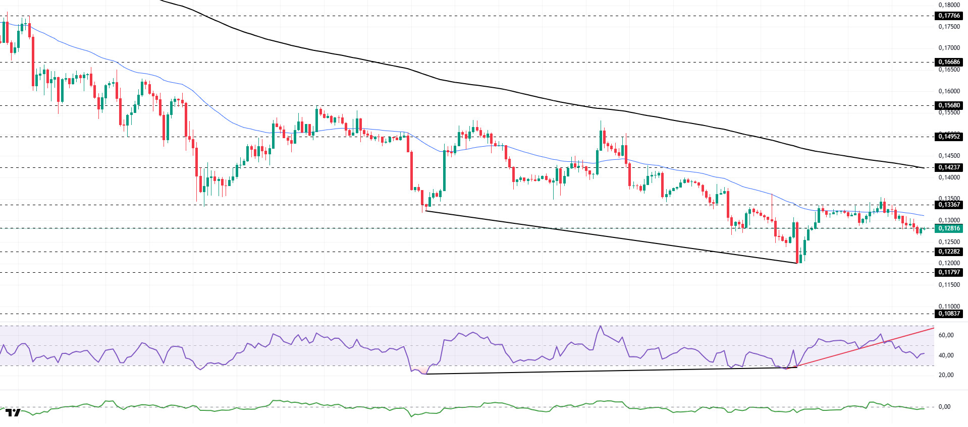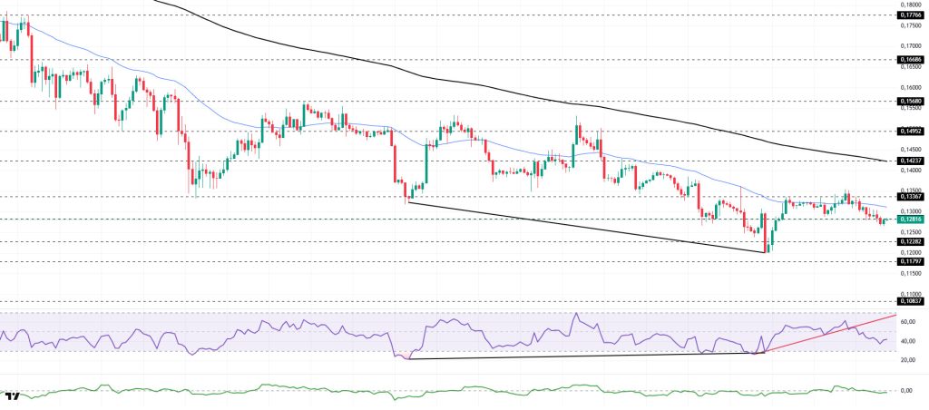 The DOGE price showed a slight increase during the day. The asset remained below the 50 EMA (Blue Line) moving average, signaling continued pullback pressure. Unable to break through the strong resistance level of $0.13367, the price pulled back and is currently testing the $0.12824 level as resistance. If momentum continues, the 50 EMA moving average could act as resistance. In the event of a pullback, the $0.12282 level should be monitored.