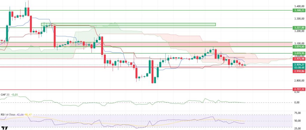 In the overall picture, the lower band of the cloud, which is at the critical threshold of $2,910, continues to be the key level. A break below this level could lead to increased selling pressure and a deeper decline. Conversely, a break above the $3,020 level could break the current negative structure and pave the way for an upward move. Under current conditions, a cautious stance prevails for ETH due to weak volume, declining momentum, and a sensitive technical structure.