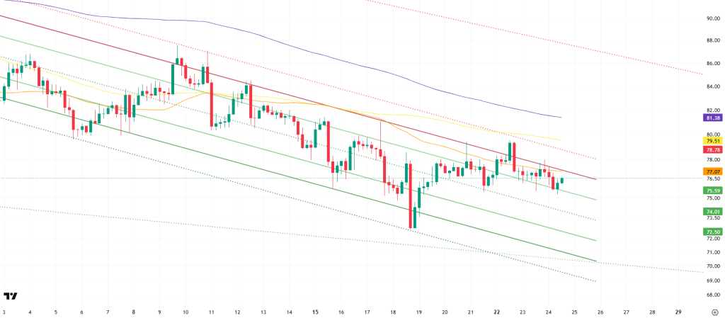 However, the current structure also holds the potential for a transition to a neutral outlook and a subsequent shift to positive territory. In this scenario, the first strong resistance level that an upward move could encounter is expected to be the 50-period moving average at 77.07 and the descending trend line it intersects. Breaking through this important resistance level would be the first critical step towards neutralizing the negative outlook. If this level is broken, 78.78 would come into focus as another important intraday falling trend resistance level to watch. If the rise gains momentum and heads towards the 79.51 level, it is likely that the movement will remain limited, as seen in previous attempts, due to the effect of the 100-period moving average.