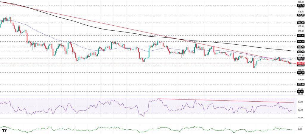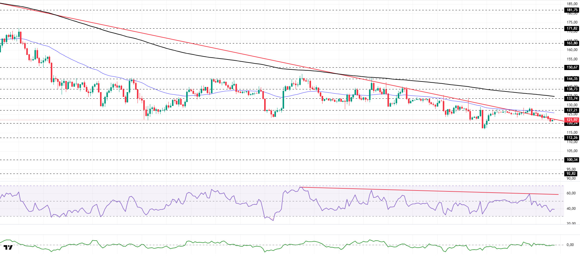 The SOL price traded sideways during the day. The asset remained in the lower region of the downtrend that began on October 8. The price, which found resistance at the 50 EMA (Blue Line) moving average, is currently testing the downtrend as resistance. With candle closes above this level, it may test the 50 EMA moving average as resistance. If the pullback continues, the $120.24 level could act as support.