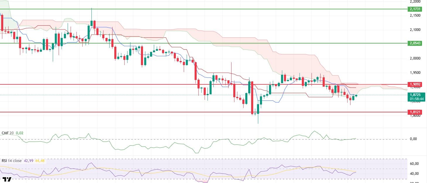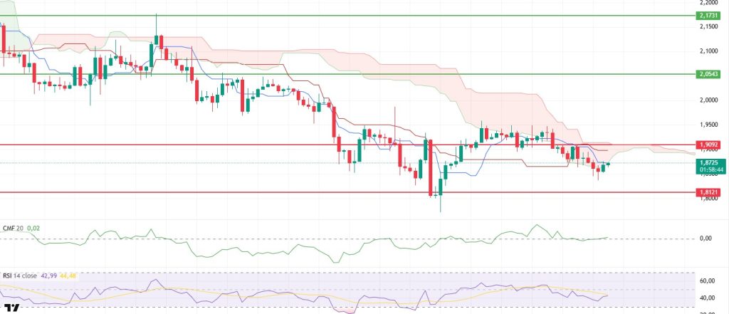 From the Ichimoku indicator perspective, the price is in a highly sensitive zone. Pricing continues around both the Tenkan line and the lower band of the kumo cloud. Closing above this zone could pave the way for the price to target the $1.90 level again. If $1.90 is breached, upward movements could take on a more pronounced structure. Conversely, the $1.81 level should be monitored as a critical support level. Losing this level could cause downward pressure to regain momentum.