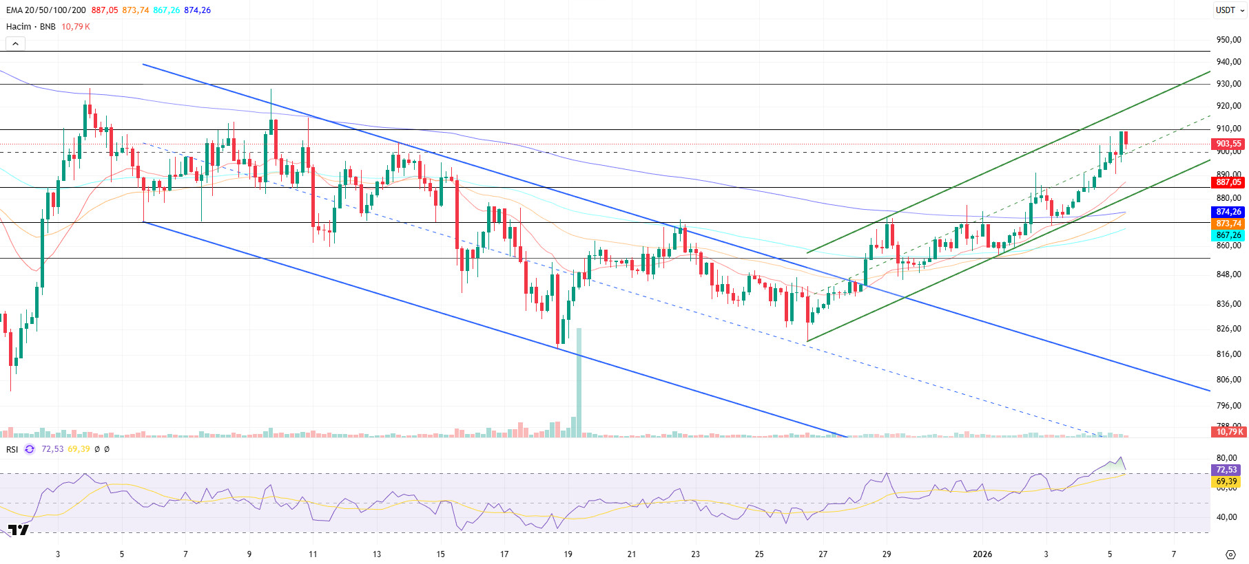 However, BNB, which reversed its direction upward again with the support it received from the middle band of the descending channel, strengthened its upward momentum by breaking the upper band of the channel upward. In this direction, the asset exceeded its previously determined target levels and passed above the $900 level. Although partial pressure is seen at these levels, the asset is considered to have maintained its overall positive structure within the current rising channel.