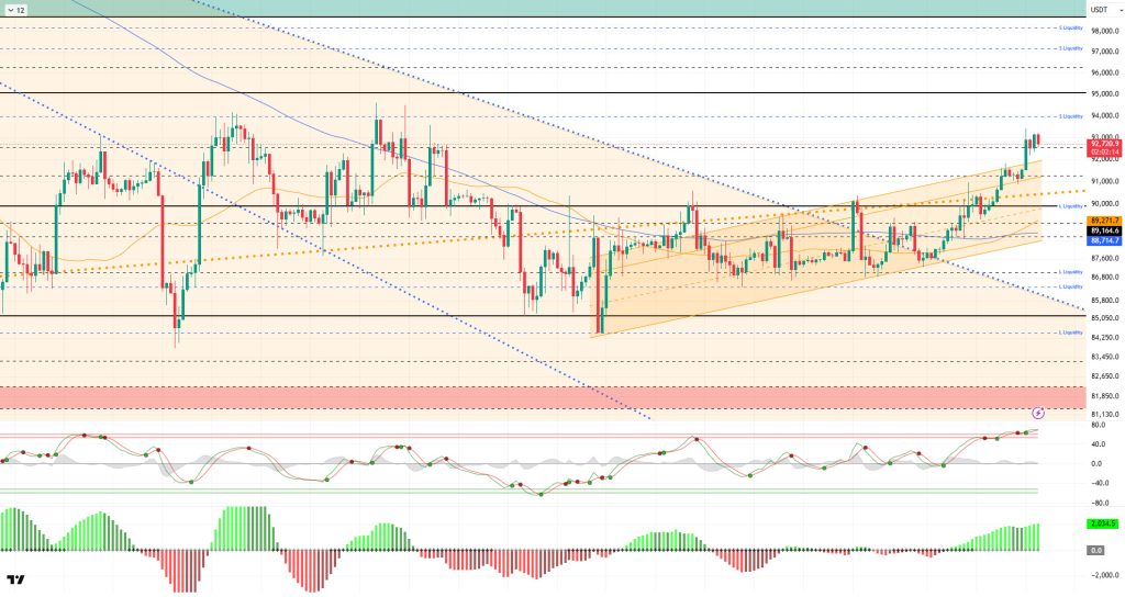 From a technical perspective, BTC finally managed to break through the 90,000 level it had been pushing parallel to its upward channel. The price first broke out of the orange band it had formed since its ATH level, then surpassed the 90,000 level we were tracking as a reference, and finally managed to break through the majorAA uptrend. Maintaining its upward momentum, the price tested the 93,400 level. At the time of writing, BTC continues to trade at the 92,500 level, showing no significant change during the day.
