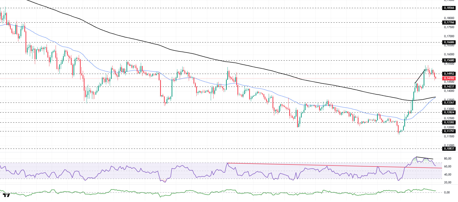 The DOGE price experienced a slight pullback during the day. The asset broke above the 200 EMA (Black Line) moving average, maintaining its momentum. However, the price tested the $0.14952 level as support and moved below it, signaling a decline in momentum. Currently continuing its decline, the price may test the $0.14237 level as support if the pullback continues. If the uptrend resumes, it may test the $0.15680 level as resistance.