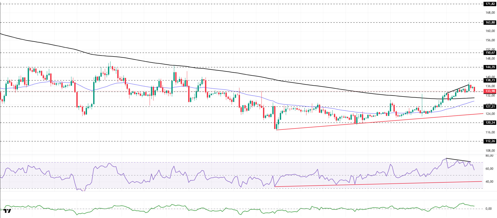 On the 4-hour chart, it remained below the 50 EMA (Exponential Moving Average – Blue Line) and 200 EMA (Black Line). This indicates that the medium-term downtrend is continuing. At the same time, the price being above both moving averages indicates that the asset is trending upward in the short term. The Chaikin Money Flow (CMF-20) is in positive territory. However, an increase in money outflows could push the CMF back into negative territory. The Relative Strength Index (RSI-14) has retreated from overbought levels to the middle of positive territory. At the same time, it continues to trade above the rising line that began on December 18. This indicates that buying pressure continues. On the other hand, negative divergence should be monitored. If there is an uptrend due to macroeconomic data or positive news related to the Solana ecosystem, the $150.67 level stands out as a strong resistance point. If this level is broken upwards, the uptrend is expected to continue. In case of pullbacks due to developments in the opposite direction or profit-taking, it may test the $127.21 level. If it retreats to these support levels, an increase in buying momentum may present a potential upside opportunity.