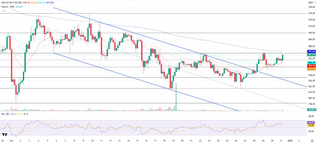 However, BNB, which turned upward with the support it received from the middle band of the descending channel, gained positive momentum by breaking the upper band of the channel upward. In this direction, the asset rose above the previously determined target level of $860 and reached the $875 level. Although partial pressure is seen at these levels, the overall technical outlook is considered to maintain its positive structure.