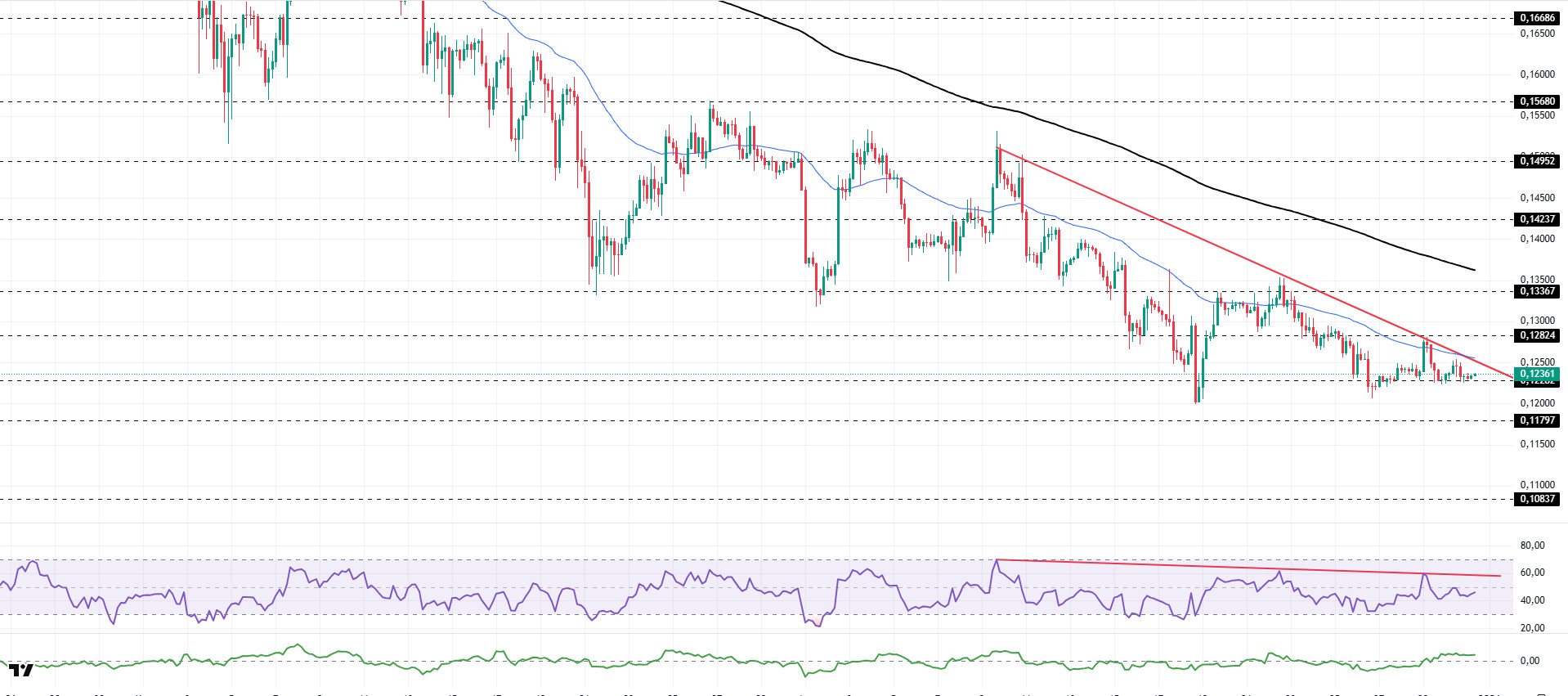 The DOGE price showed a slight decline. The asset tested the 50 EMA (Blue Line) moving average and the descending trend line that began on the 9th as resistance but failed to hold here and experienced a pullback. Currently testing the $0.12282 level as support, the price may retest the 50 EMA (Blue Line) moving average and the downward trend as resistance if it closes above this level. If the pullback continues, the $0.11797 level may act as support again.