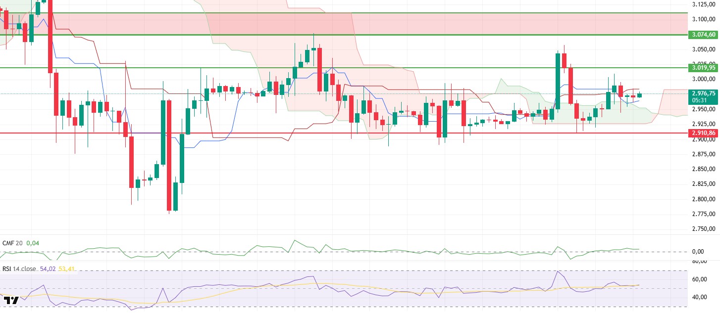 Last night, ETH’s upward movement met resistance at the $3,009 level, and the price retreated with selling pressure from this area. The decline continued to $2,945, but with selling pressure weakening at this level, a rebound began. The price is currently seeking equilibrium around $2,975. This price behavior during the day shows that buyers have not completely retreated, but that the area above $3,000 is still challenging.