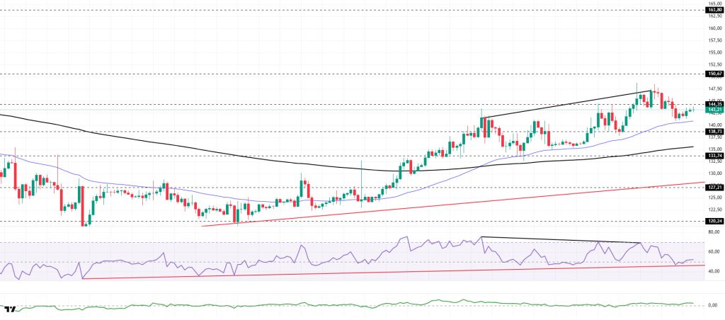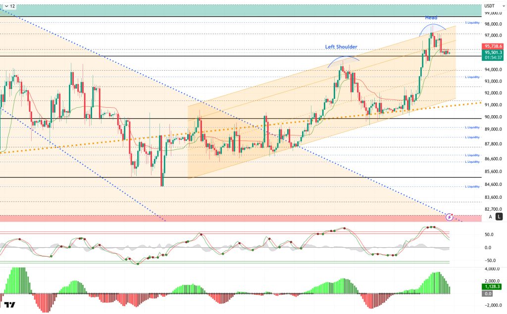 From a technical perspective, BTC continued its price movements parallel to the upward channel but failed to break through the critical 98,000 level el its first attempt. It then retreated slightly and tested the reference level of 95,000. Currently finding support en this region, BTC occasionally dips to the 90,000 level during the day but manages to maintain its efforts to stay above this region. Following the cup-and-handle pattern that formed en its price, BTC formed a rising peak, drawing attention to the OBO pattern that emerged. For the OBO, a trend reversal pattern, to remain valid, the price is expected to form a lower peak after the correction movement.