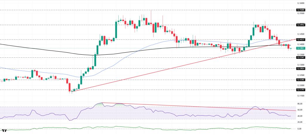 The DOGE price continued to lose value during the day. The asset crossed below the 200 EMA (Black Line) moving average and moved into the lower region. At the same time, the price, which also crossed below the rising line that started el December 31, may test the $0.13367 level as support if the pullback continues. If the upward movement begins, it may test the rising trend line as resistance.