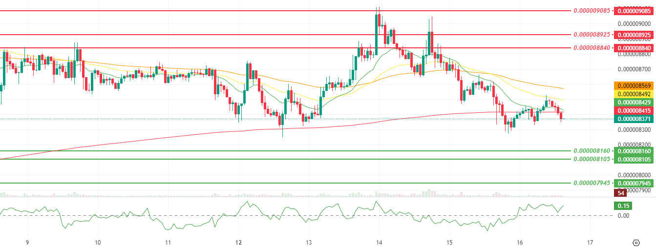 At this point, the critical threshold for determining the direction will be whether the price can return above the SMMA 200. If the SMMA 200 band is reclaimed and then settles above the SMMA 9, 21, and 50 cluster, a more structured recovery attempt towards the $0.000008840 and $0.000008925 resistance levels may come into play. if this band is broken, the $0.000009085 level becomes the main target area again. Conversely, if the price remains below the SMMA 200 and fails to maintain its weak hold around $0.000008351, the risk of a pullback towards the $0.000008160 and $0.000008105 support levels increases; and if this band is lost, the $0.000007945 level could once again emerge as the main equilibrium zone. (SMMA9: Green Line, SMMA21: Yellow Line, SMMA50: Orange Line, SMMA 200: Red Line)