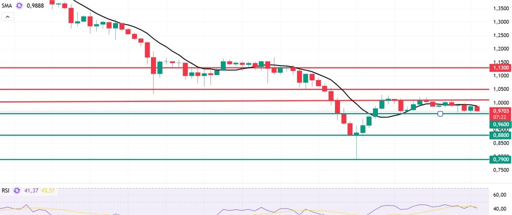 Looking at Sui’s technical outlook, we see that the price has fallen over the past 4 horas and is now moving sideways at around $0.96, influenced por fundamental developments. The Relative Strength Index (RSI) is currently en the range of 41.37 – 43.51. This range indicates that the market is trading close to the sell zone; however, if the RSI weakens and falls to the 35.00 – 40.00 range, it could signal a potential buying point. If the price moves upward, the resistance levels of $1.00, $1.05, and $1.13 can be monitored. However, if the price falls to new lows, it could indicate that selling pressure is intensifying. In this case, the $0.96 and $0.80 levels stand out as strong support zones. Based el the trend line, a pullback to $0.80 appears technically possible. According to Simple Moving Averages (SMA) data, Sui’s average price is currently at $0.98. If the price remains below this level, it could signal that the current upward trend may not continue technically. The downward trend of the SMA also supports this scenario.