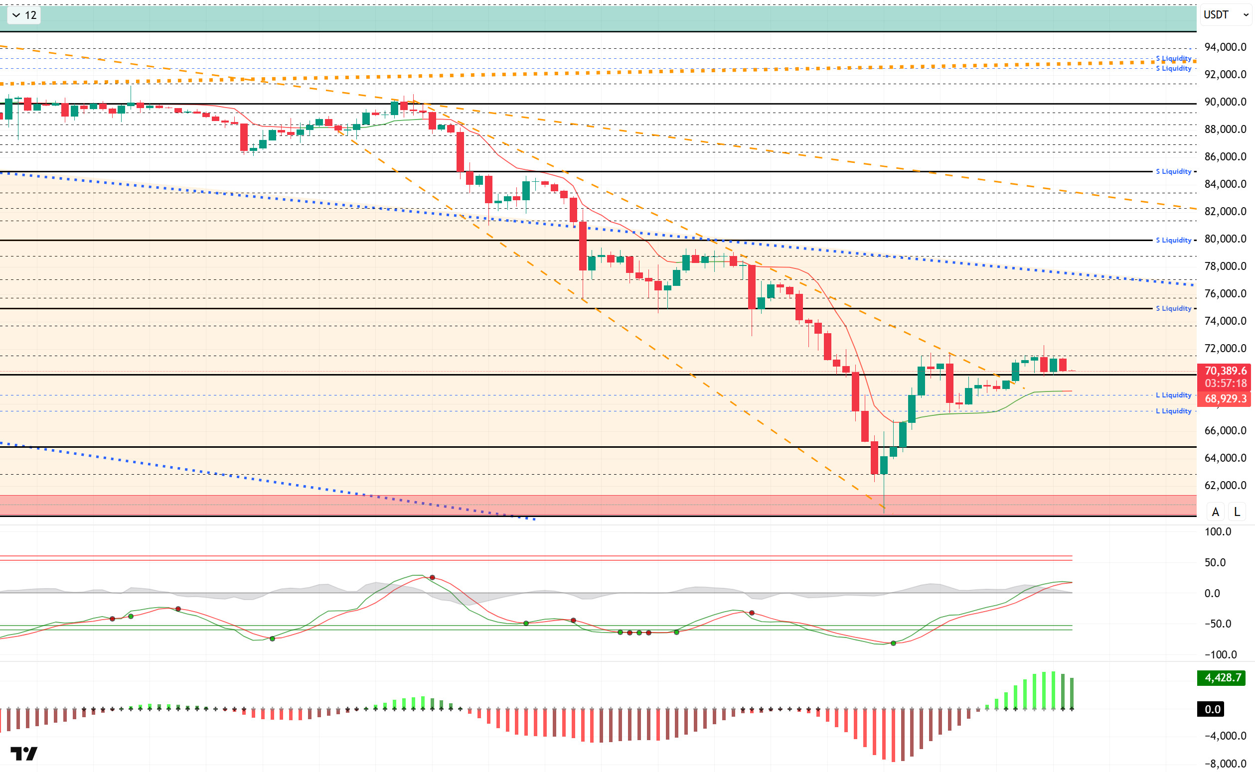 In summary, while Fed officials remain unanimous el interest rate policy, Trump continues his pre-election rhetoric. On the geopolitical front, while no progress was made en the Iran talks, Trump described the talks as very good. Tensions continue el the Russia-Ukraine front, while Japan’s election victory resonated. After the buy orders were cleared en the liquidity data, the direction shifted to sell orders. Technically, BTC started the new year with positive momentum, but after testing the 98,000 level, it entered a sharp sell-off, falling to the 60,000 level. Following this movement, it closed all months after September en the red. BTC, which also started February with a decline, briefly lost the critical range of 70,000-80,000 levels and returned to its pre-Trump pricing. Having managed to recover from this point, the price is now attempting to hold above the 70,000 level. If this level is maintained, the price is expected to make a move towards the 75,000 level, while a downward break could see a double bottom formation.