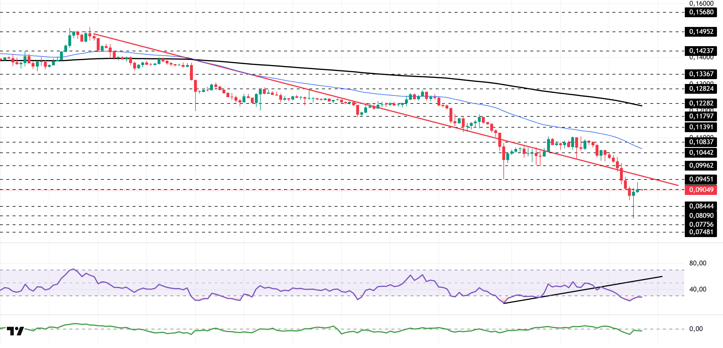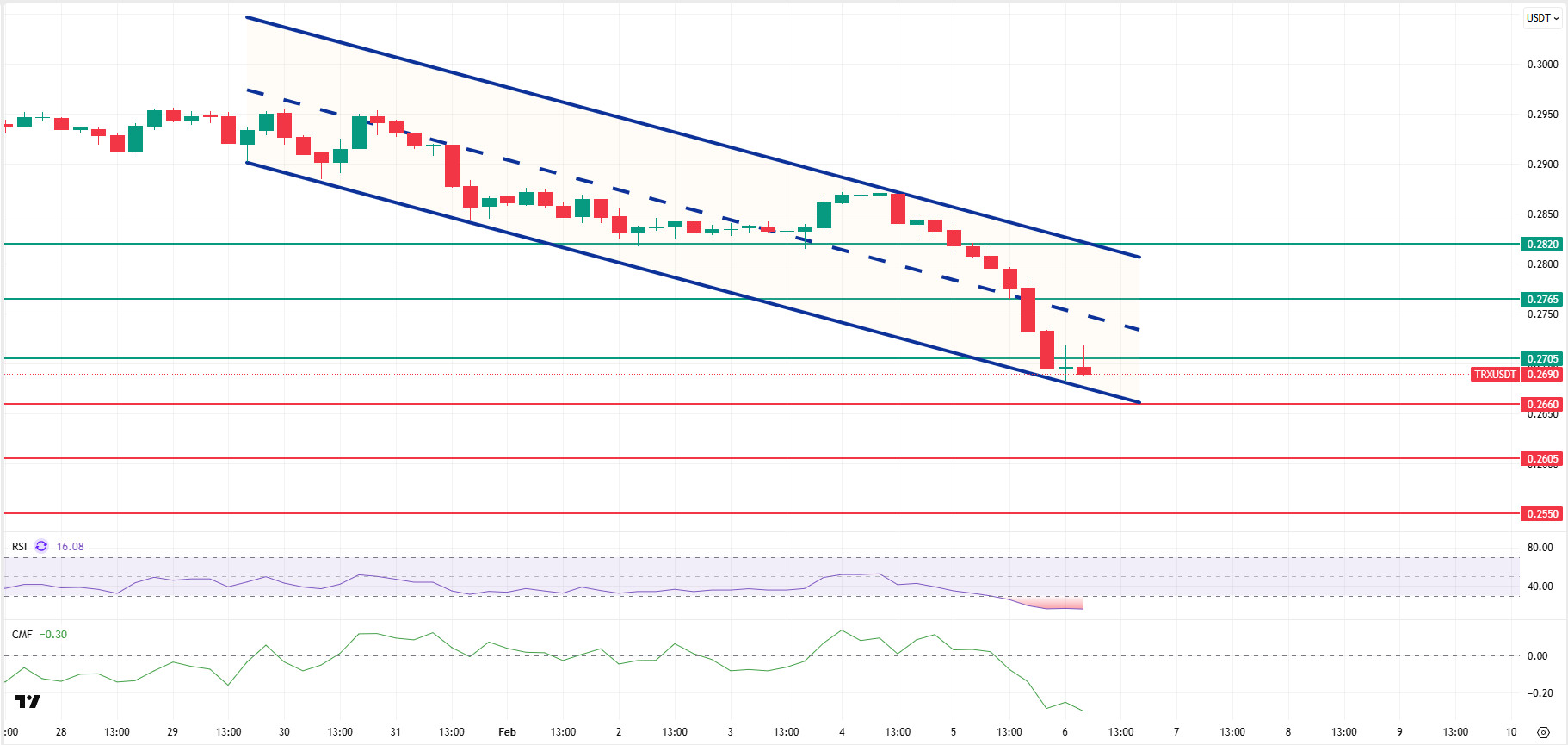 Technically speaking, TRX closed yesterday at $0.2696 after the decline and lost some more value en the morning horas, currently trading at $0.2690. Currently en the lower band of the bearish channel, TRX is priced below the $0.2705 resistance el the 4-hora chart. The Relative Strength Index (RSI) value is seen at 16 en the oversold zone, its lowest level since October 10. In addition, the Chaikin Money Flow (CMF) indicator value is -0.30, below the zero zone, indicating a significant outflow of money and strong selling pressure. This outlook suggests that buyers remain weak en the short term and that downside risks el the price are increasing.